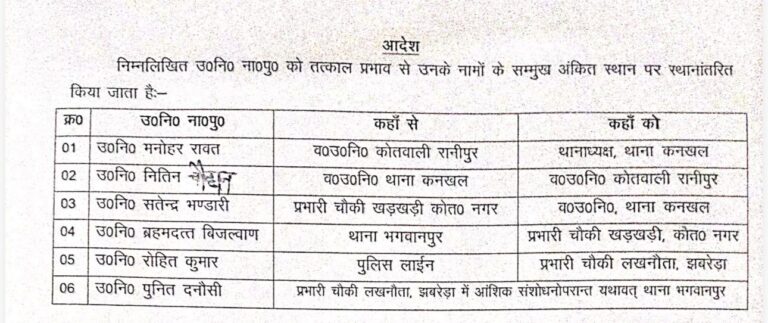 खड़खड़ी चौकी प्रभारी सतेंद्र भंडारी को कनखल का एसएसआई बनाया गया है।
